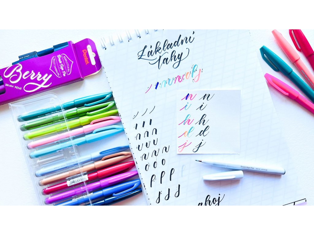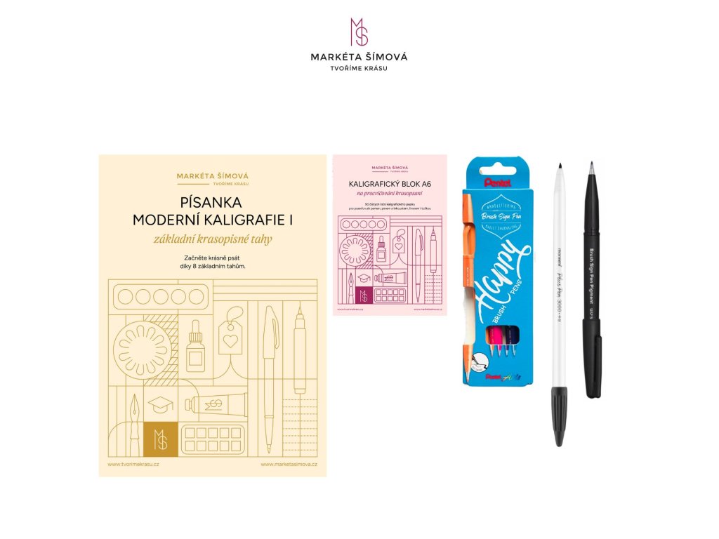 Jednotlivé pomůcky jsou pečlivě vybrané tak, aby se vám s nimi skvěle psalo a zároveň byly kvalitní a odolné. Proto v sadě najdete brush peny renomované japonské značky Pentel, liner od prestižního korejského výrobce, moji autorskou písanku a kapesní blok na procvičování.