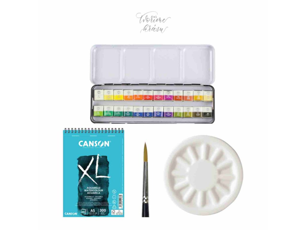 Tento balíček pomůcek pro malování akvarelem byl sestaven tak, aby obsahoval vše, co je pro tuto techniku především v začátcích třeba. Najdete v něm kvalitní prověřené pomůcky osvědčených výrobců za rozumnou cenu.